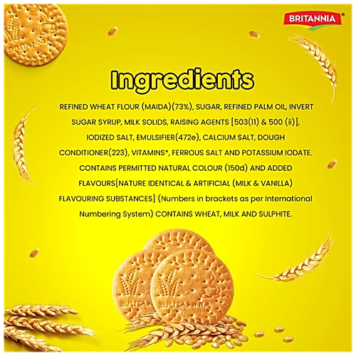 Refined Wheat Flour (Maida), Sugar, Edible Vegetable Oil, Milk Solids, Raising Agents, Salt, Flavors (Milk & Vanilla), Vitamins & Minerals.​