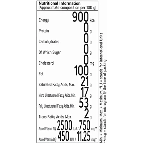 Nutrition: Balanced PUFA (60%), MUFA (22%), low saturated fat, zero cholesterol.​