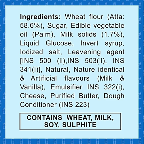 Whole Wheat Flour (Atta), Cow’s Milk Solids, Sugar, Edible Vegetable Oil, Raising Agents, Salt.