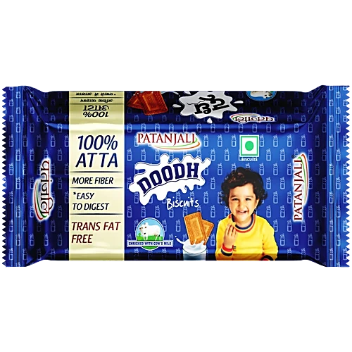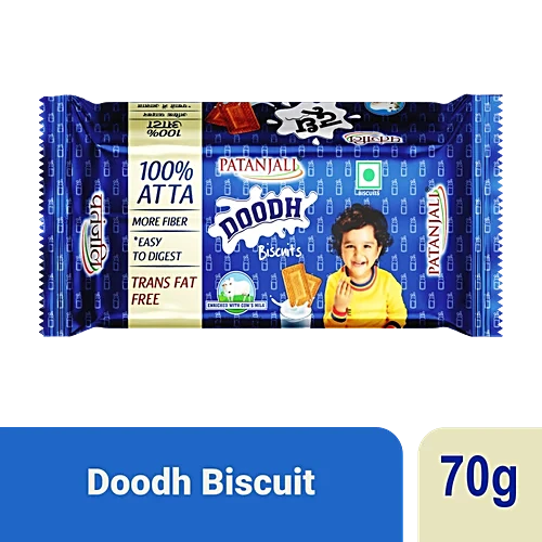 Patanjali Doodh Biscuit 70g ek nutritious atta-based milk biscuit hai jo cow’s milk solids aur whole wheat se banaya gaya hai. Yeh fiber-rich healthy snack deta hai tea ke saath perfect taste ke liye, no maida ke saath pure natural goodness.​
