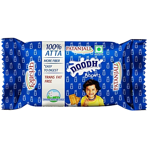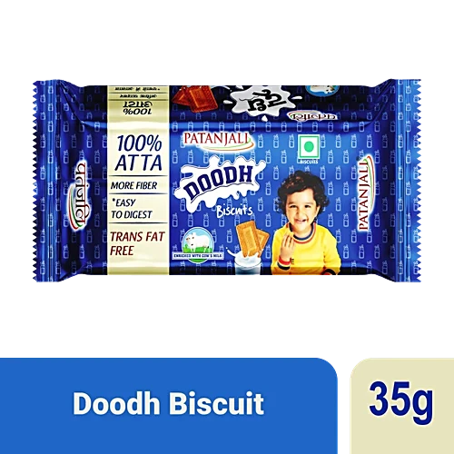 Patanjali Doodh Biscuits 35g 100% atta se bane wholesome milk biscuits hain jo cow’s milk aur fiber se enriched hote hain. Yeh healthy energy snack hai tea-coffee ke saath perfect, no maida-no refined flour ke saath digestion friendly.​