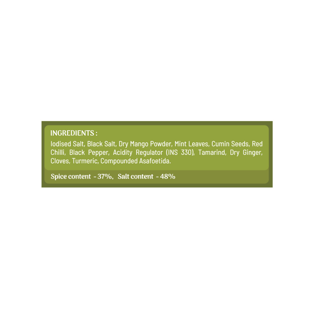 Iodised Salt, Dry Mango Powder, Kachari, Cumin Seeds, Mint Leaves, Acidity regulator(INS330), Black salt, Watermelon Seeds, Black Pepper, Red Chilli, Dry Ginger, Cloves, Green Cardamom, Carom Seeds & Compounded Asafoetida, Cinnamon.